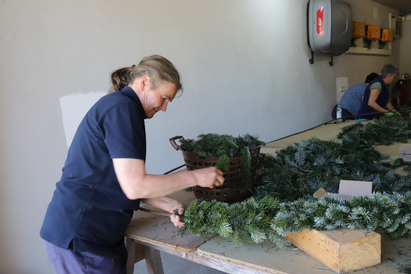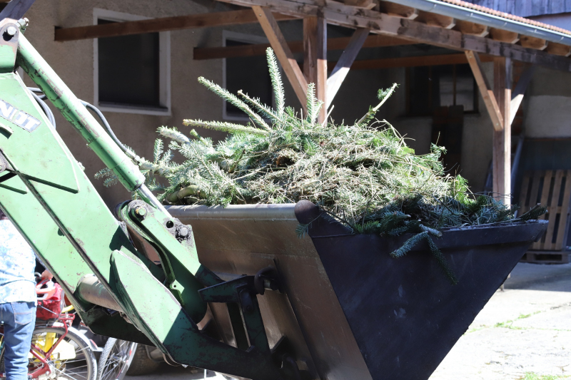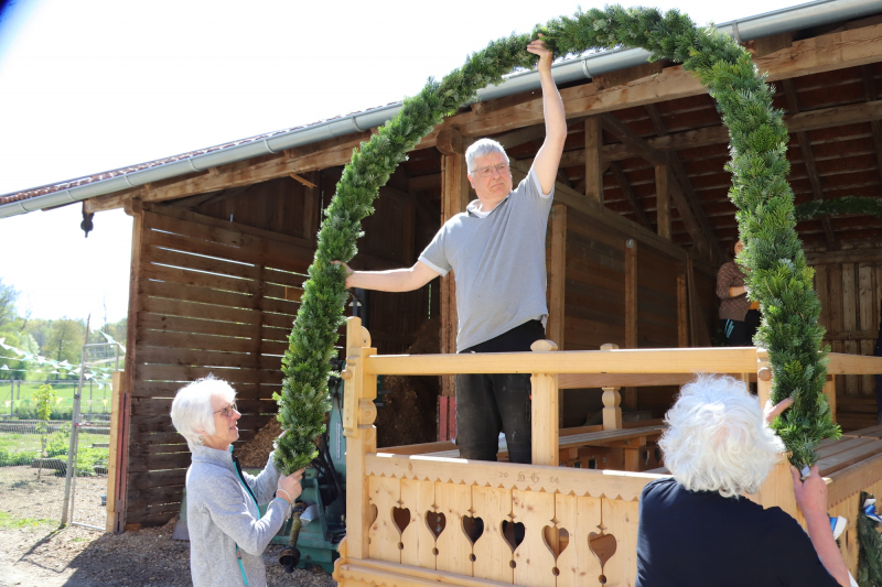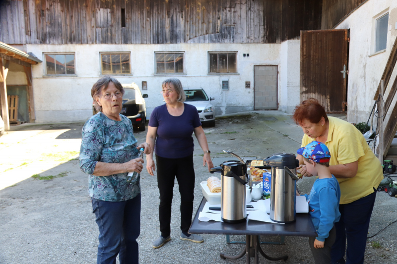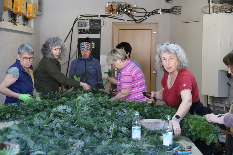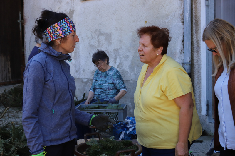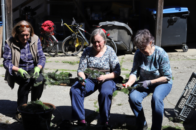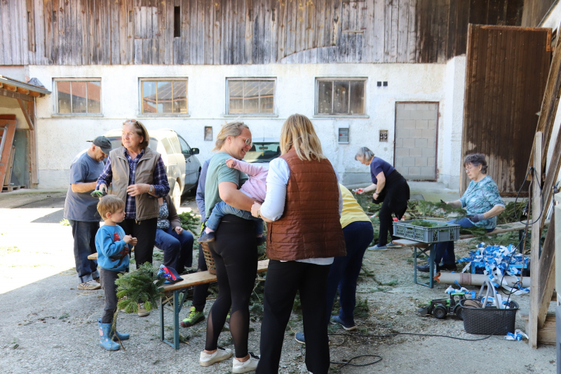 Kranzbinden für Georgiritt beim Koll in Schmerbach. Der Trachtenverein und Gartenbauverein Tittmoning verarbeiteten einen ganzen Schwung Daxen zu Büscherl und Girlanden. Zum Schluß gab’s noch gute Kuchen und Kaffee für Alle.
