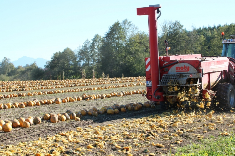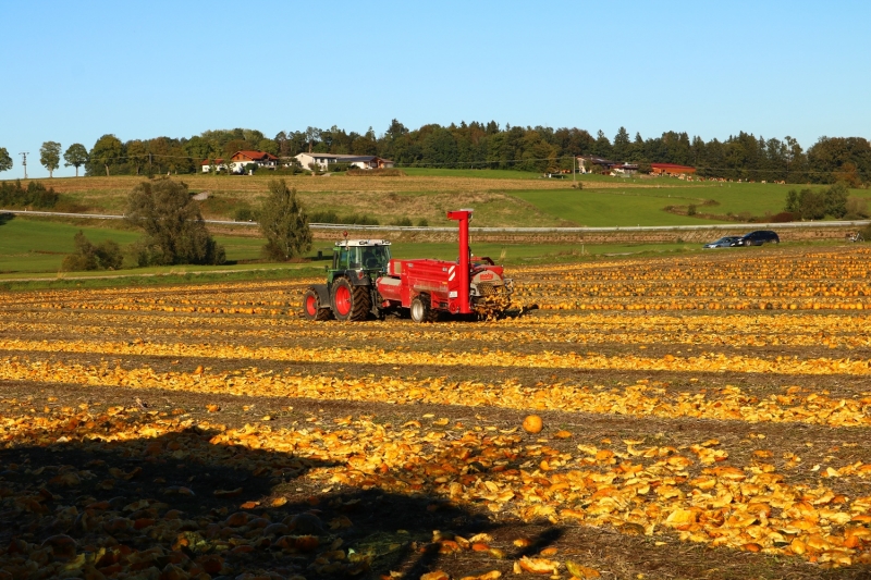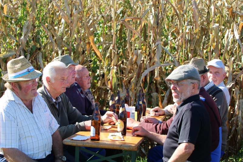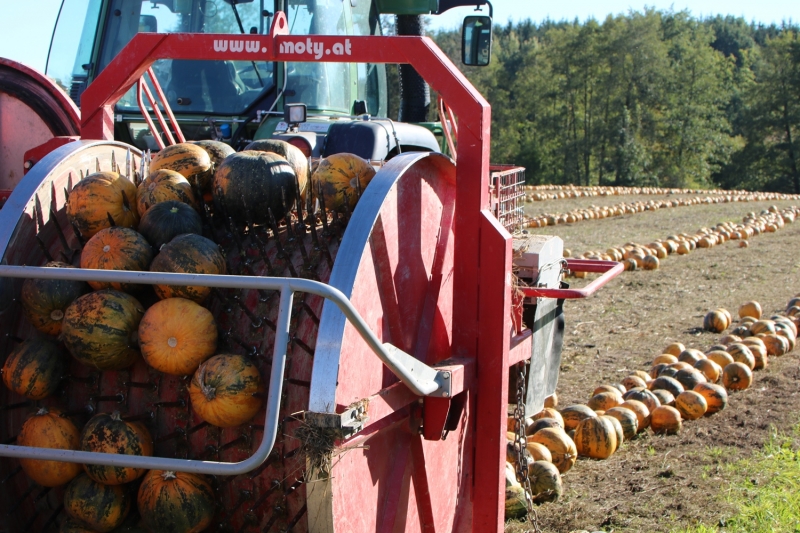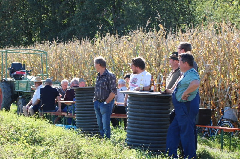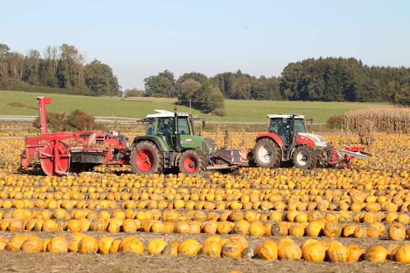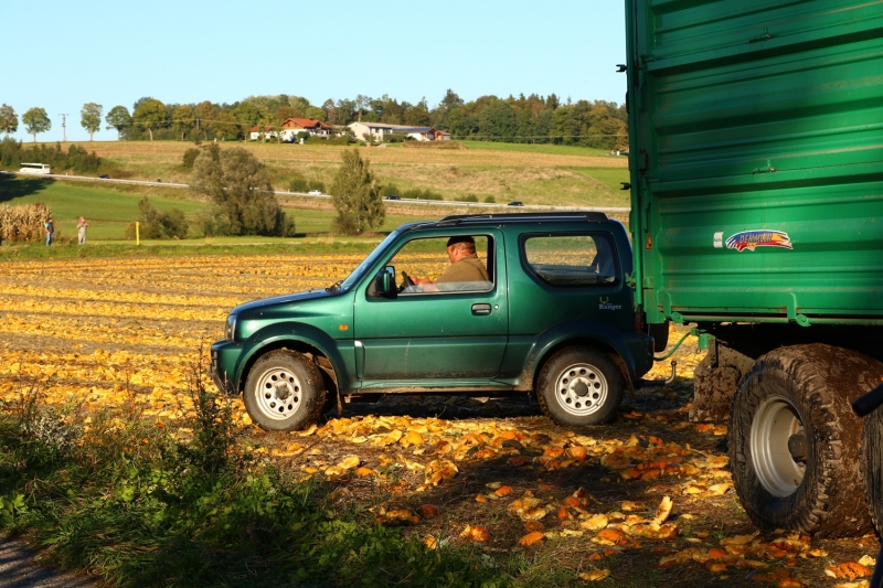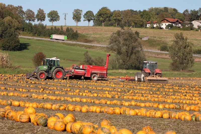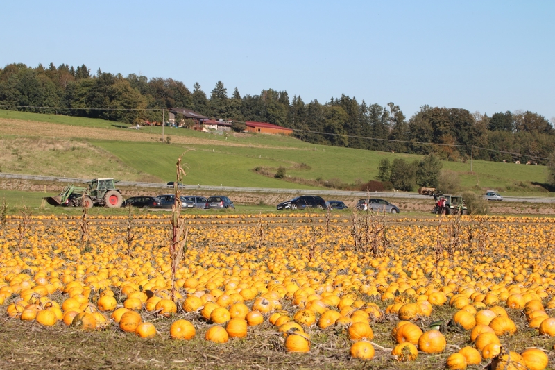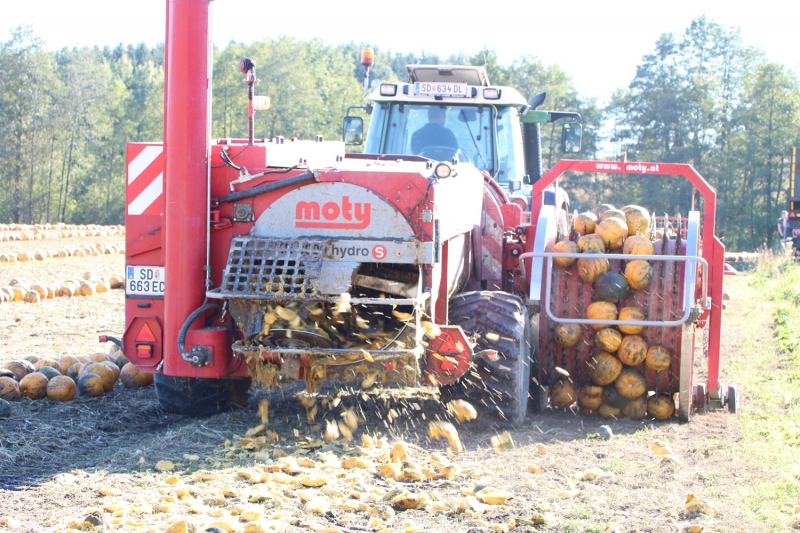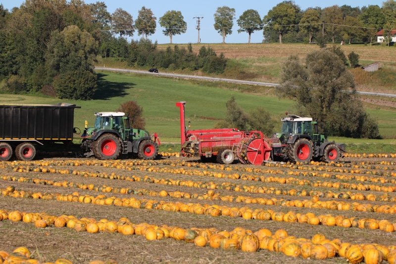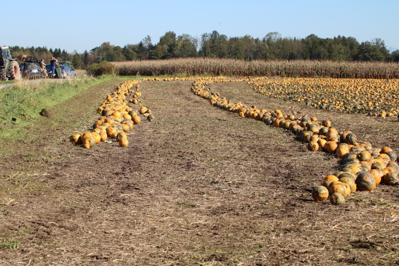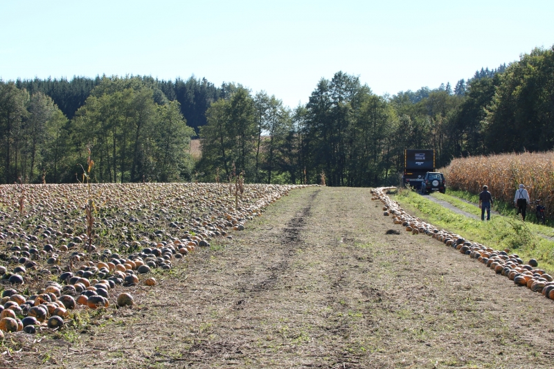 Heuer gab es das erste Mal eine Kürbisernte in der Ledern. Unser Vereinsmitglied Johann Glück „Wirt in der Ledern“ baute Heuer zum ersten Mal Kürbise an, aus denen die Kerne gewonnen wurden. Zum Einsatz kamen eine Art Schneepflug, der die Kürbise auf Zeilen zusammen schob. Später kam der Vollernter auf das Feld, der nahm die Kugeln auf erntete die Kerne und spuckte hinten die zerkleinerten Reste wieder aus, dann förderte die Maschine wie beim Mähdrescher über eine Röhre die Körner auf einen Kipper. Das Interesse an der Ernte war groß und somit lieferte die Wirtin prompt eine kleine Brotzeit direkt ans Feld.