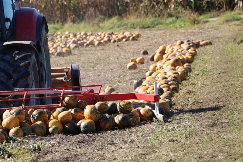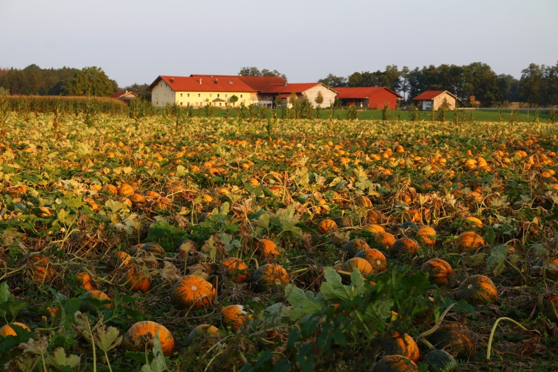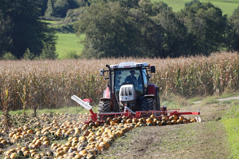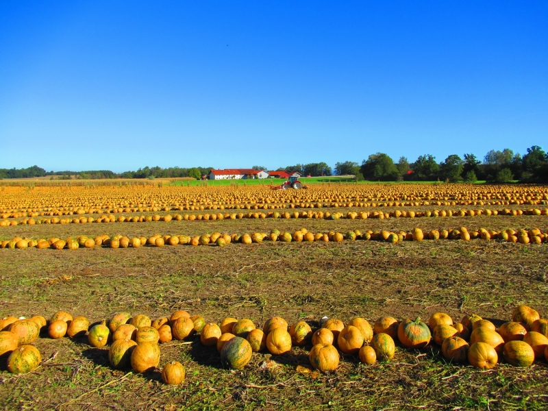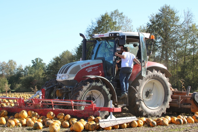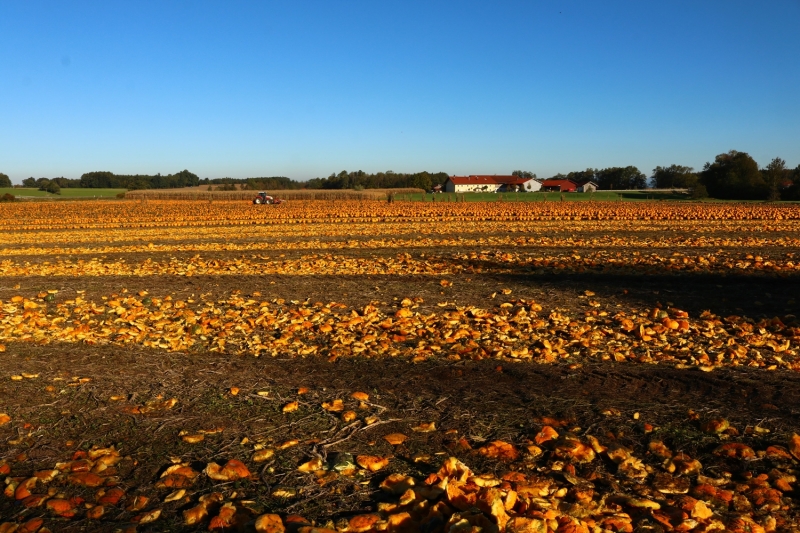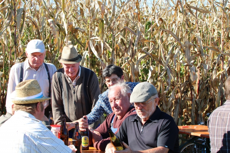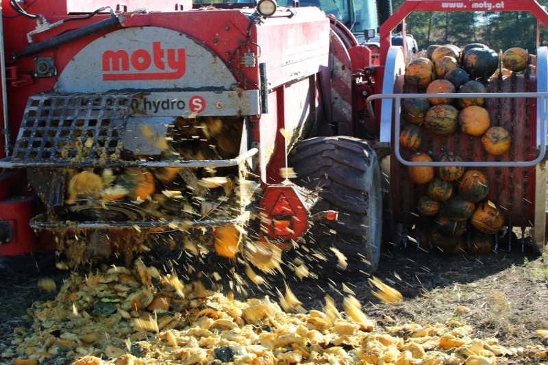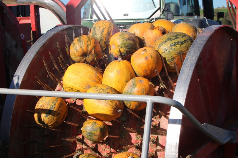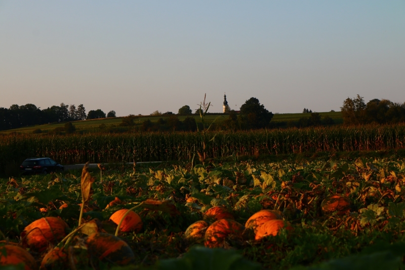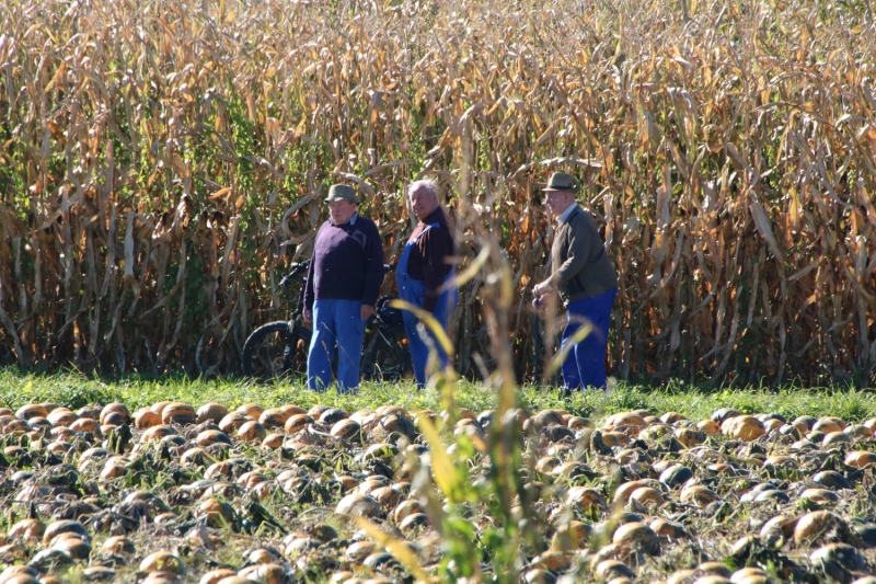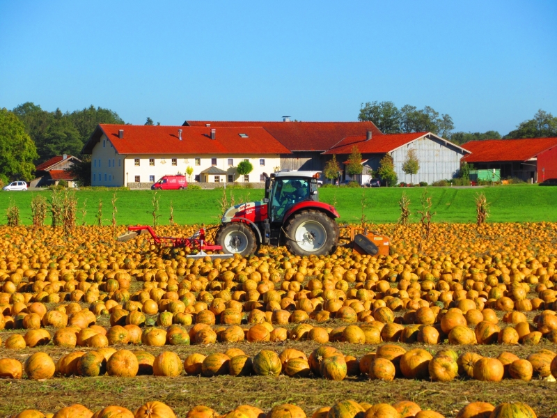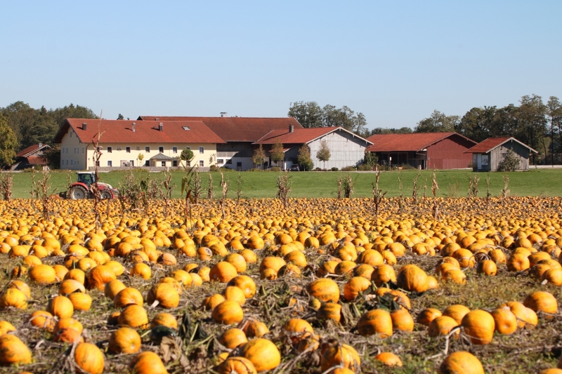 Heuer gab es das erste Mal eine Kürbisernte in der Ledern. Unser Vereinsmitglied Johann Glück „Wirt in der Ledern“ baute Heuer zum ersten Mal Kürbise an, aus denen die Kerne gewonnen wurden. Zum Einsatz kamen eine Art Schneepflug, der die Kürbise auf Zeilen zusammen schob. Später kam der Vollernter auf das Feld, der nahm die Kugeln auf erntete die Kerne und spuckte hinten die zerkleinerten Reste wieder aus, dann förderte die Maschine wie beim Mähdrescher über eine Röhre die Körner auf einen Kipper. Das Interesse an der Ernte war groß und somit lieferte die Wirtin prompt eine kleine Brotzeit direkt ans Feld.