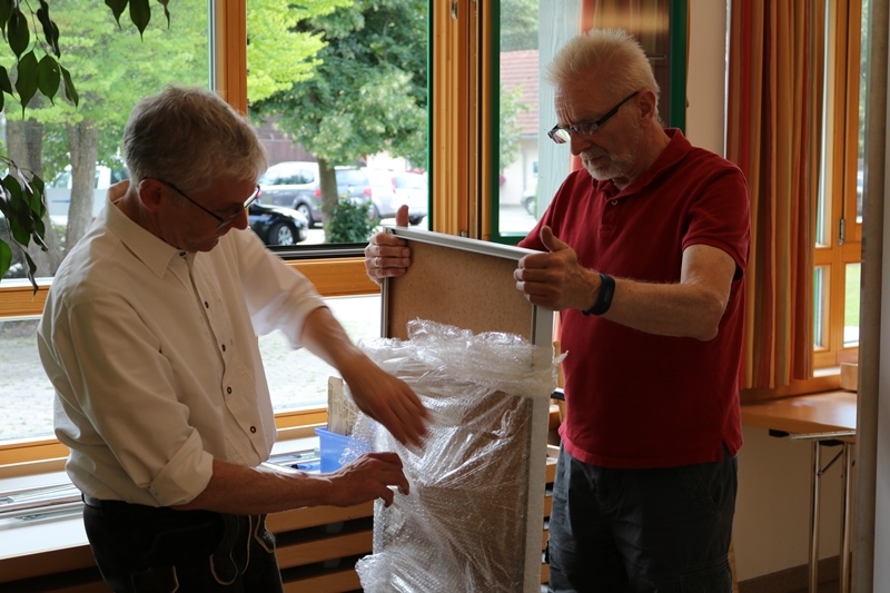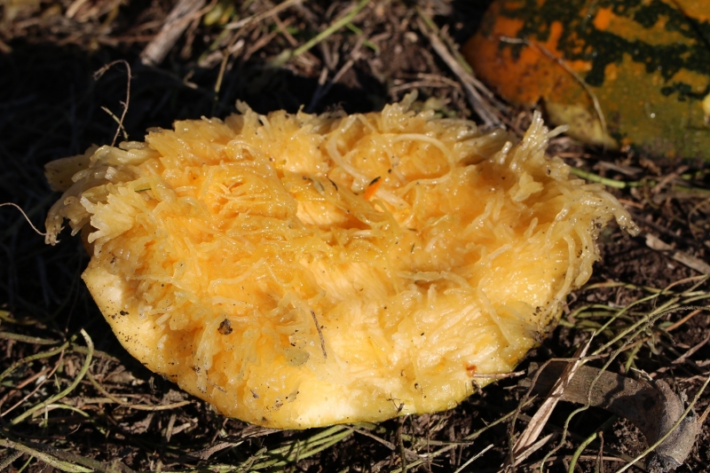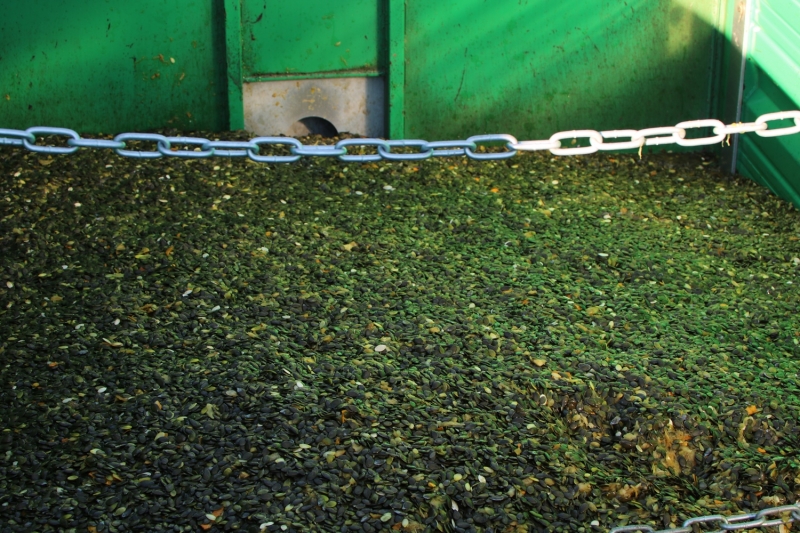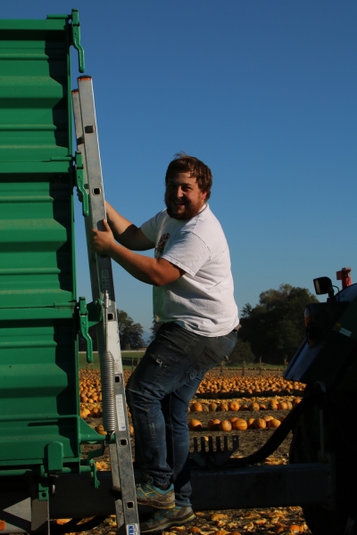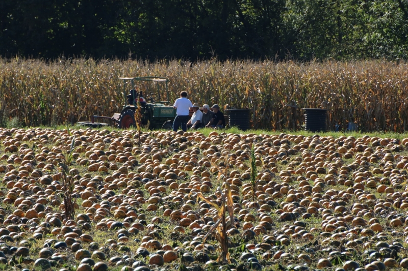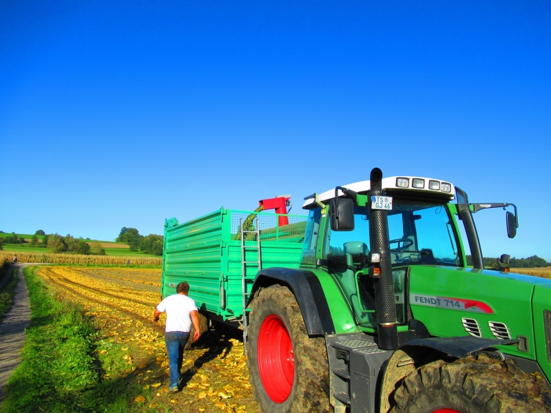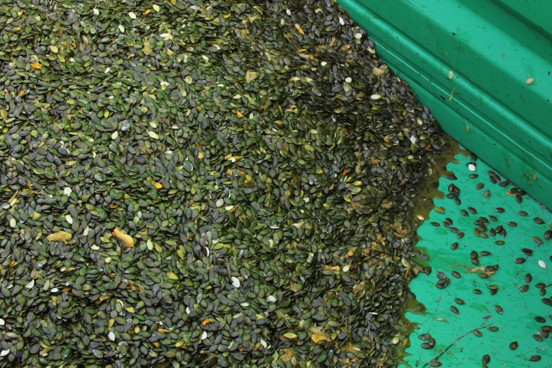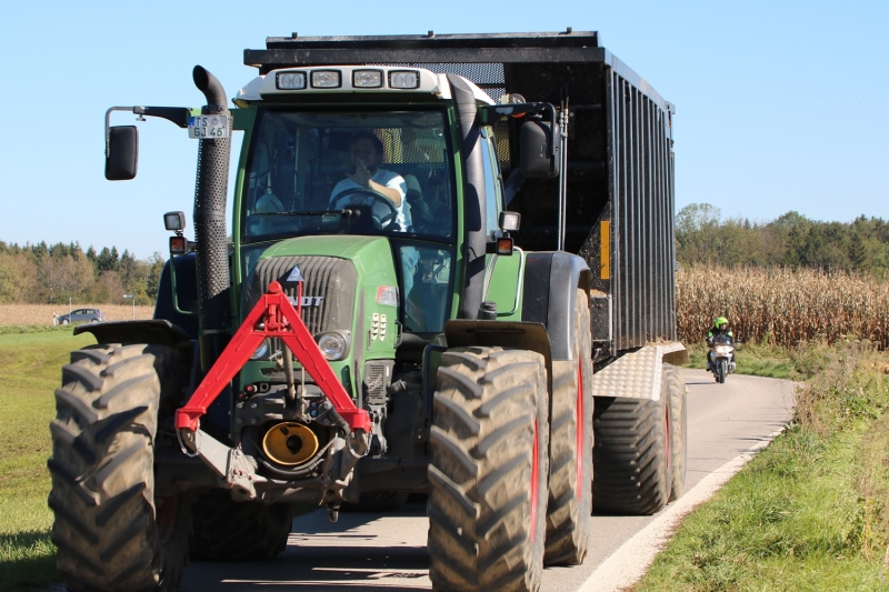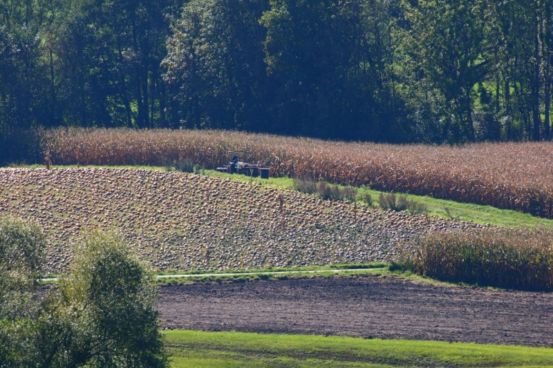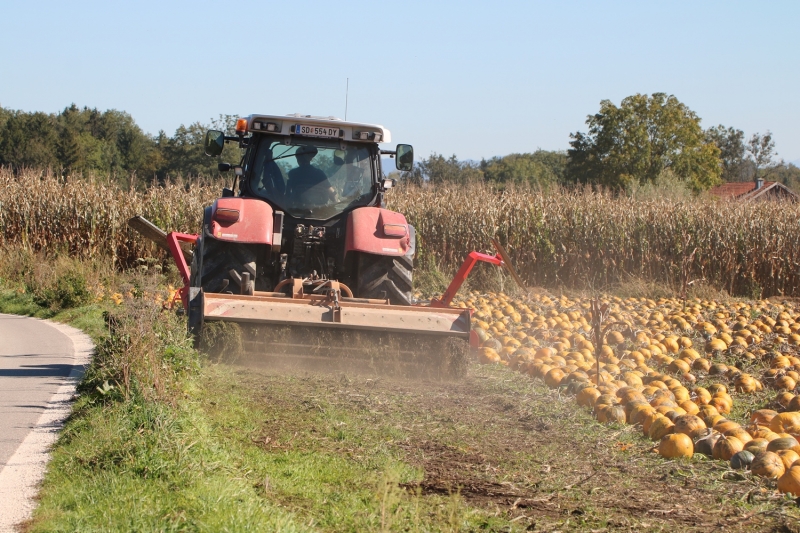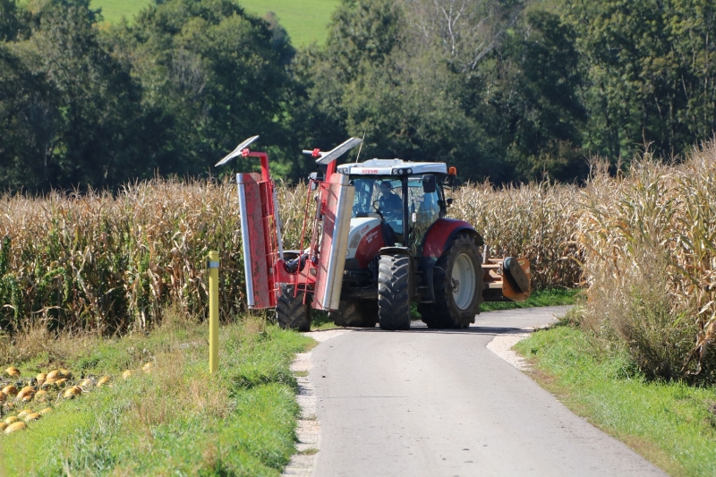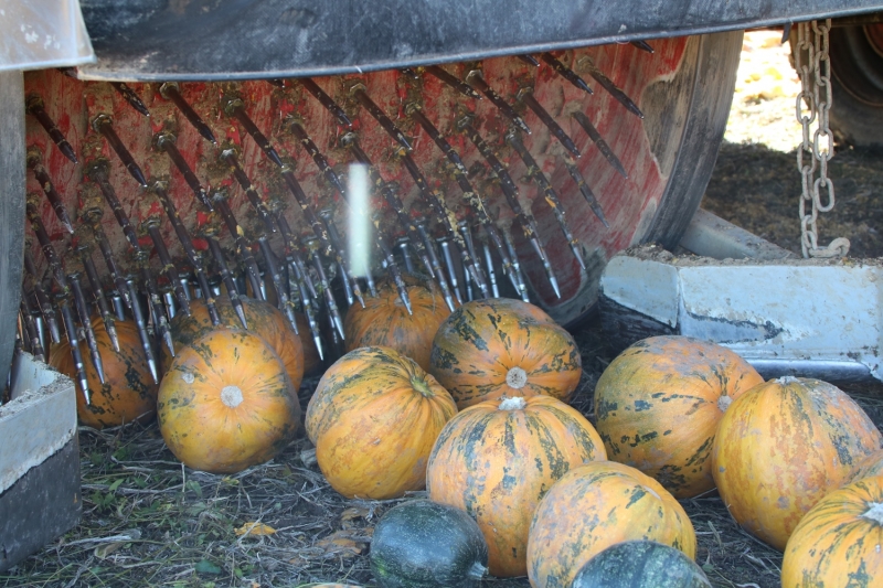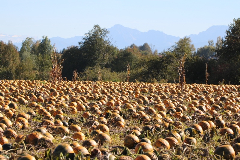 Heuer gab es das erste Mal eine Kürbisernte in der Ledern. Unser Vereinsmitglied Johann Glück „Wirt in der Ledern“ baute Heuer zum ersten Mal Kürbise an, aus denen die Kerne gewonnen wurden. Zum Einsatz kamen eine Art Schneepflug, der die Kürbise auf Zeilen zusammen schob. Später kam der Vollernter auf das Feld, der nahm die Kugeln auf erntete die Kerne und spuckte hinten die zerkleinerten Reste wieder aus, dann förderte die Maschine wie beim Mähdrescher über eine Röhre die Körner auf einen Kipper. Das Interesse an der Ernte war groß und somit lieferte die Wirtin prompt eine kleine Brotzeit direkt ans Feld.